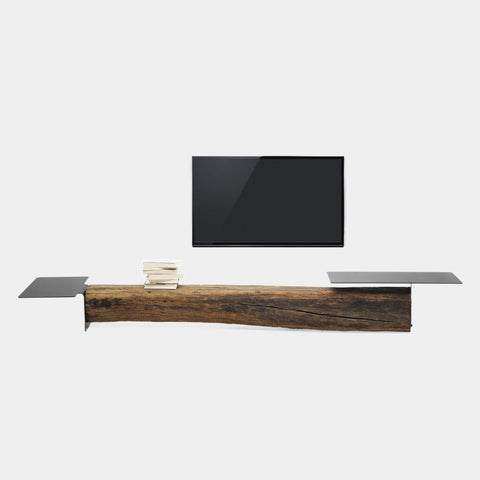 Design par Damien Gernay. Beam TV est un banc TV multifonction faite d'un vieux bois, équipée d'un plateau en métal peint au plomb. L'aspect rustique du bois, volontairement non traité, permet d'exploiter toute sa valeur expressive. Les Irrégularités de ce vieux bois doivent être considérées comme une qualité et non un défaut, qui caractérise ainsi chaque pièce.
